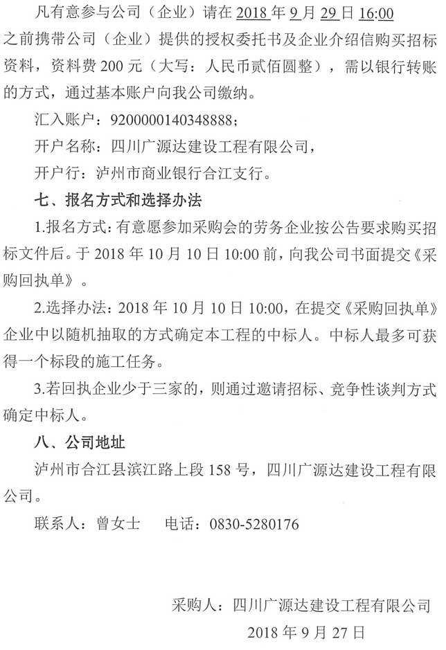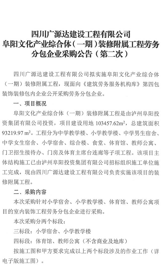 采購公告:四川廣源達(dá)建設(shè)工程有限公司阜陽文化產(chǎn)業(yè)綜合體(一期)裝修附屬工程勞務(wù)分包企業(yè)采購公告(第二次)