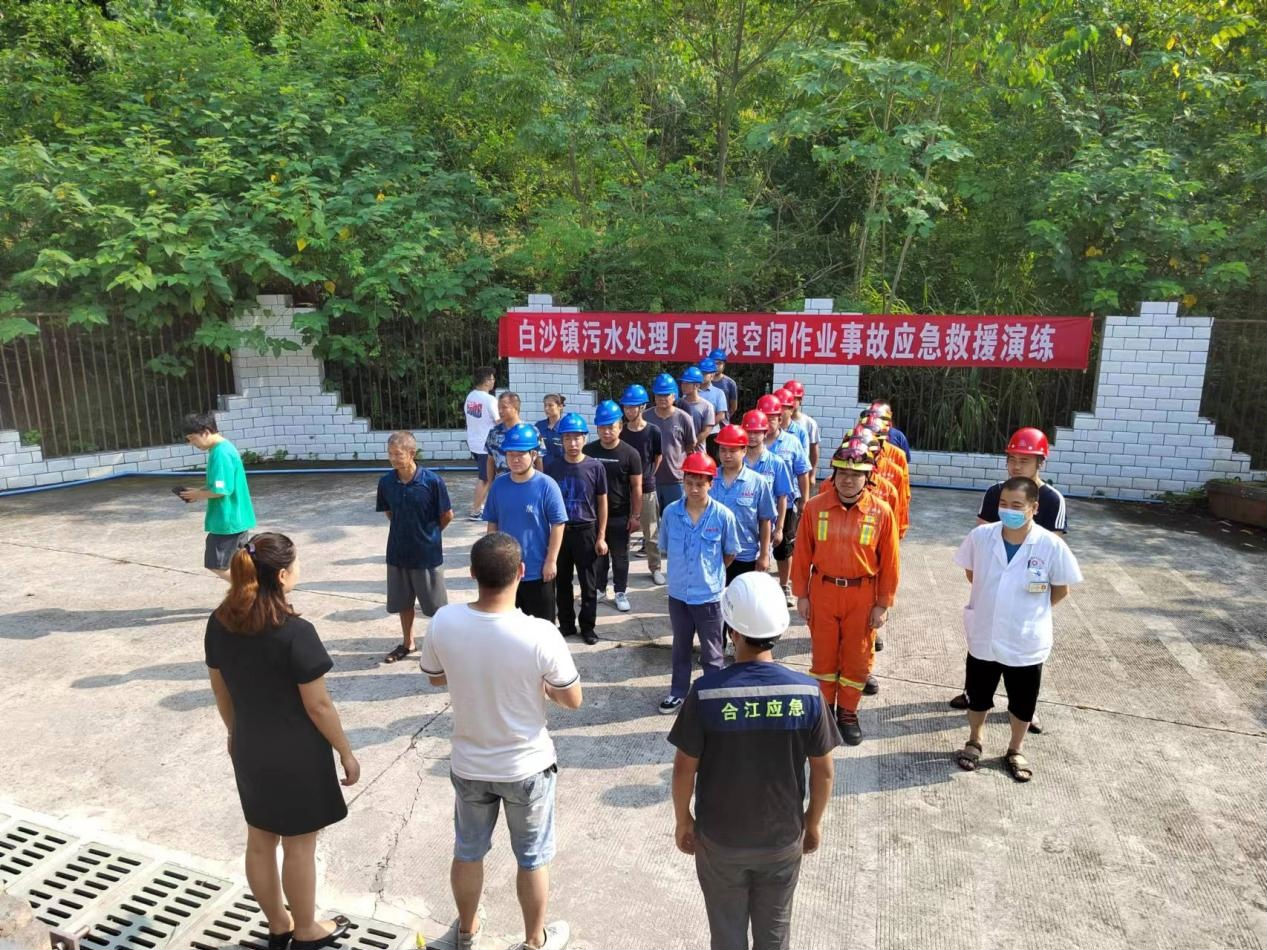 2022 年 8 月 5 日, 白沙鎮(zhèn)人民政府、 江北消防中隊(duì)、 白沙衛(wèi)生院和瀘州匯鑫環(huán)??萍加邢薰韭?lián)合在白沙鎮(zhèn)城市生活污水處理廠開展有限空間作業(yè)應(yīng)急演練, 白沙鎮(zhèn)副鎮(zhèn)長(zhǎng)周雪蓮、 安辦主任牟葉奎、 江北消防中隊(duì)指導(dǎo)員王小峰、 匯 鑫公司副經(jīng)理劉可參加了本次演練。