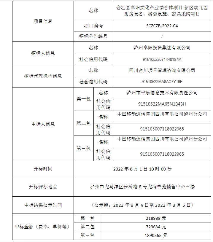 合江縣阜陽文化產(chǎn)業(yè)綜合體項(xiàng)目-新區(qū)幼兒園廚房設(shè)備、游樂設(shè)施、家具采購項(xiàng)目公開招標(biāo)中標(biāo)結(jié)果公告