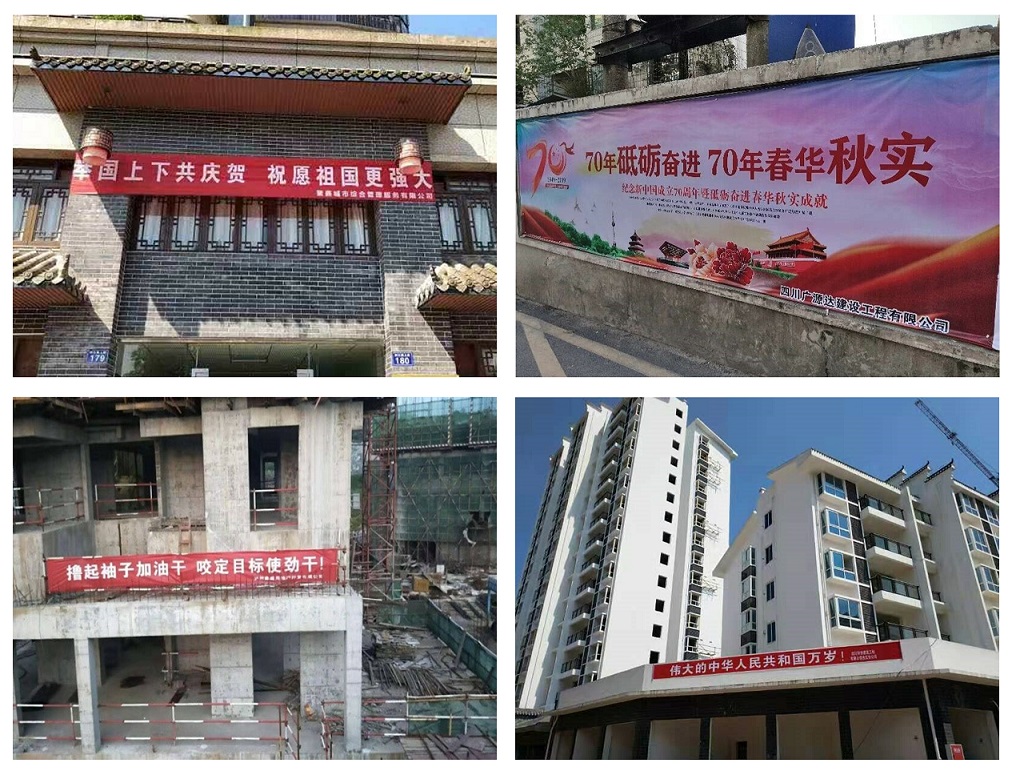 為慶祝新中國成立70周年,城投公司、廣源達公司、鑫晟公司于近日在公司項目部、售樓部等地懸掛慶祝標語,激發(fā)群眾愛國熱情,營造良好國慶氛圍!